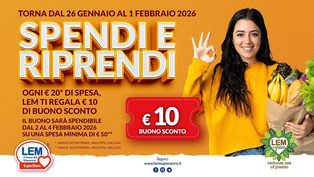 Nei giorni dal 26 Gennaio al 1 Febbraio su una spesa di € 20,00 (unico scontrino, multipli inclusi) LEM TI REGALA UN BUONO del valore di 10,00 € spendibile dal 2 al 4 Febbraio su una spesa minima di € 50,00 (unico scontrino, cumulabile con altri buoni spendi e riprendi).