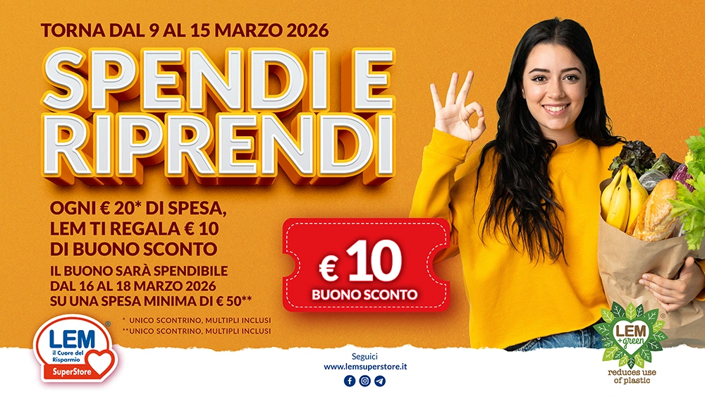 Nelle giornate della promozione i clienti del punto vendita Lem Superstore che effettueranno una spesa minima di Euro 20,00 con scontrino unico (e multipli), riceveranno un Buono Sconto del valore di Euro € 10,00.